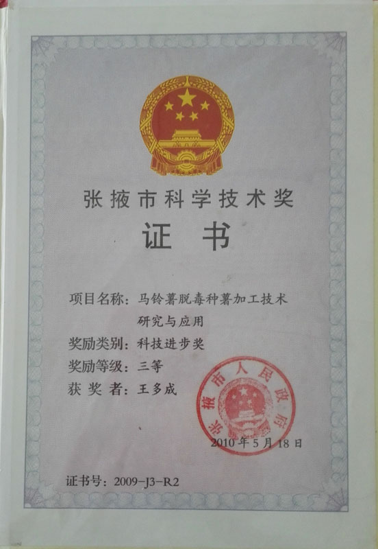 2010年榮獲張掖市科技進(jìn)步三等獎(jiǎng)證書