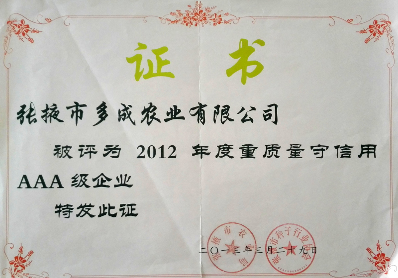 2012年度重質(zhì)量守信用AAA級(jí)企業(yè)