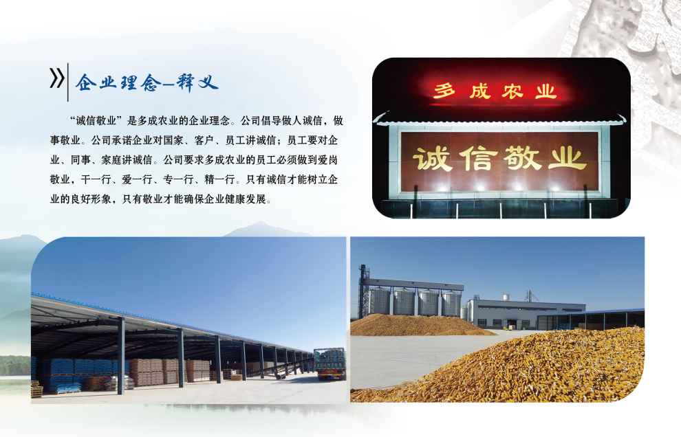 "誠信敬業(yè)“是多成農業(yè)的企業(yè)理念。公司倡導做人誠信,做事敬業(yè)。公司承諾企業(yè)對國家、客戶、員工講誠信;員工要對企業(yè)、同事、家庭講誠信。公司要求多成農業(yè)的員工必須做到愛崗敬業(yè),干一行、愛一行、專一行、精一行。只有誠信才嫩個樹立企業(yè)的良好形象,只有敬業(yè)才能確保企業(yè)健康發(fā)展 |